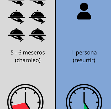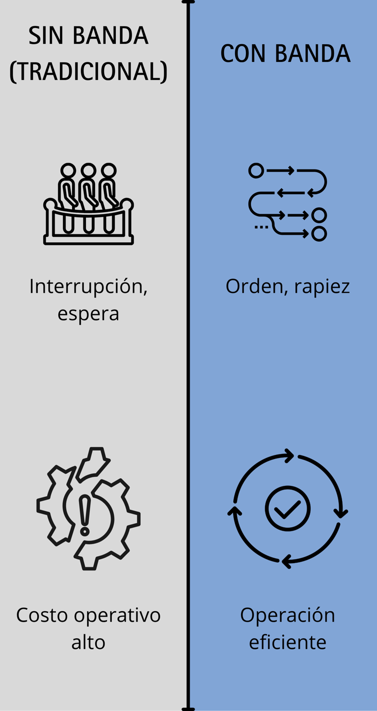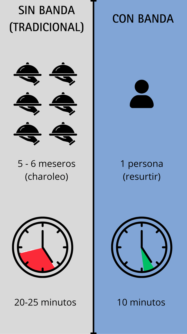 Como podemos observar, el staff operativo hace lo mismo en más tiempo y con más personas. Sin embargo, con la banda, puedes liberar a tu personal para destinarlos en actividades.